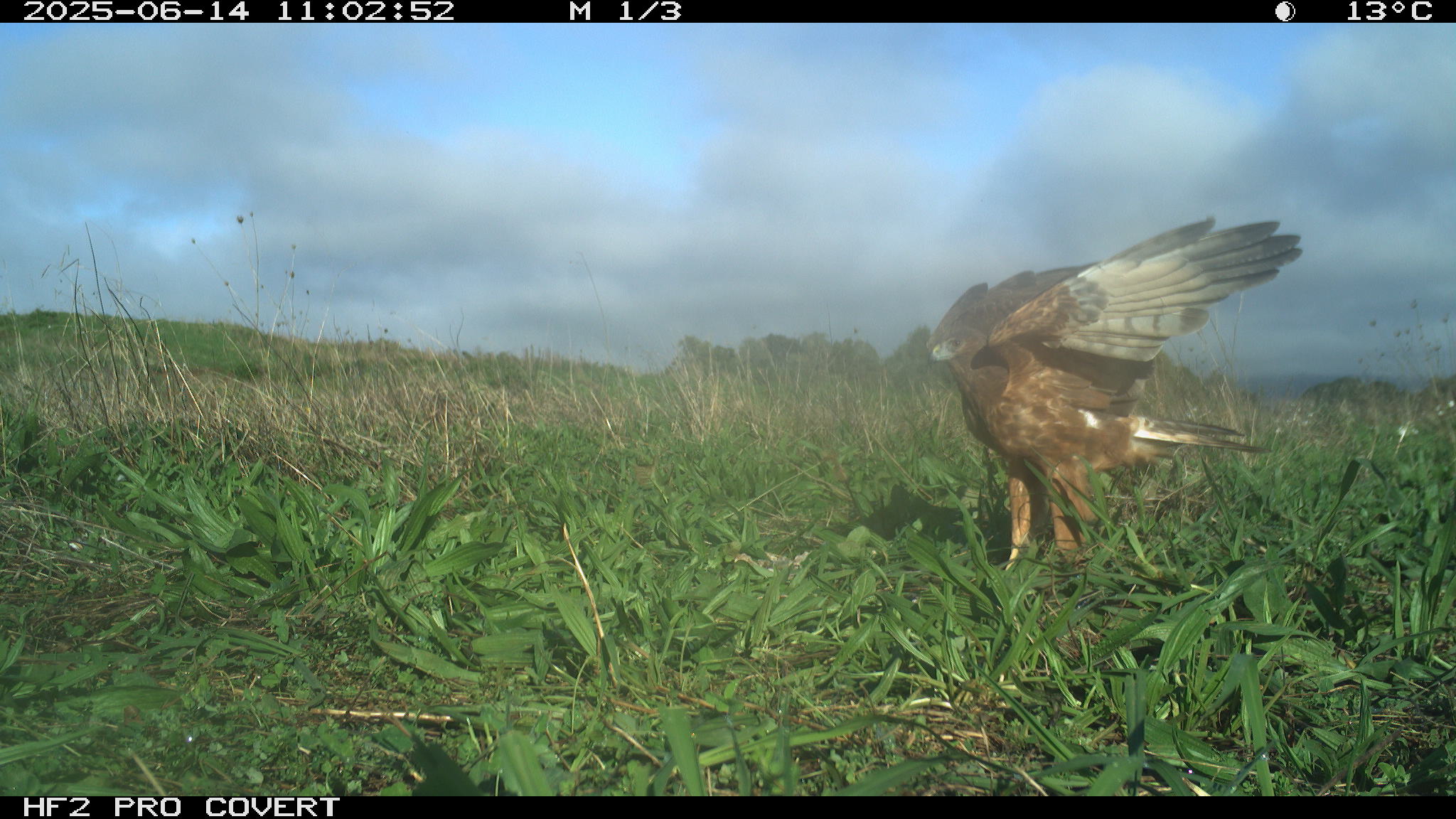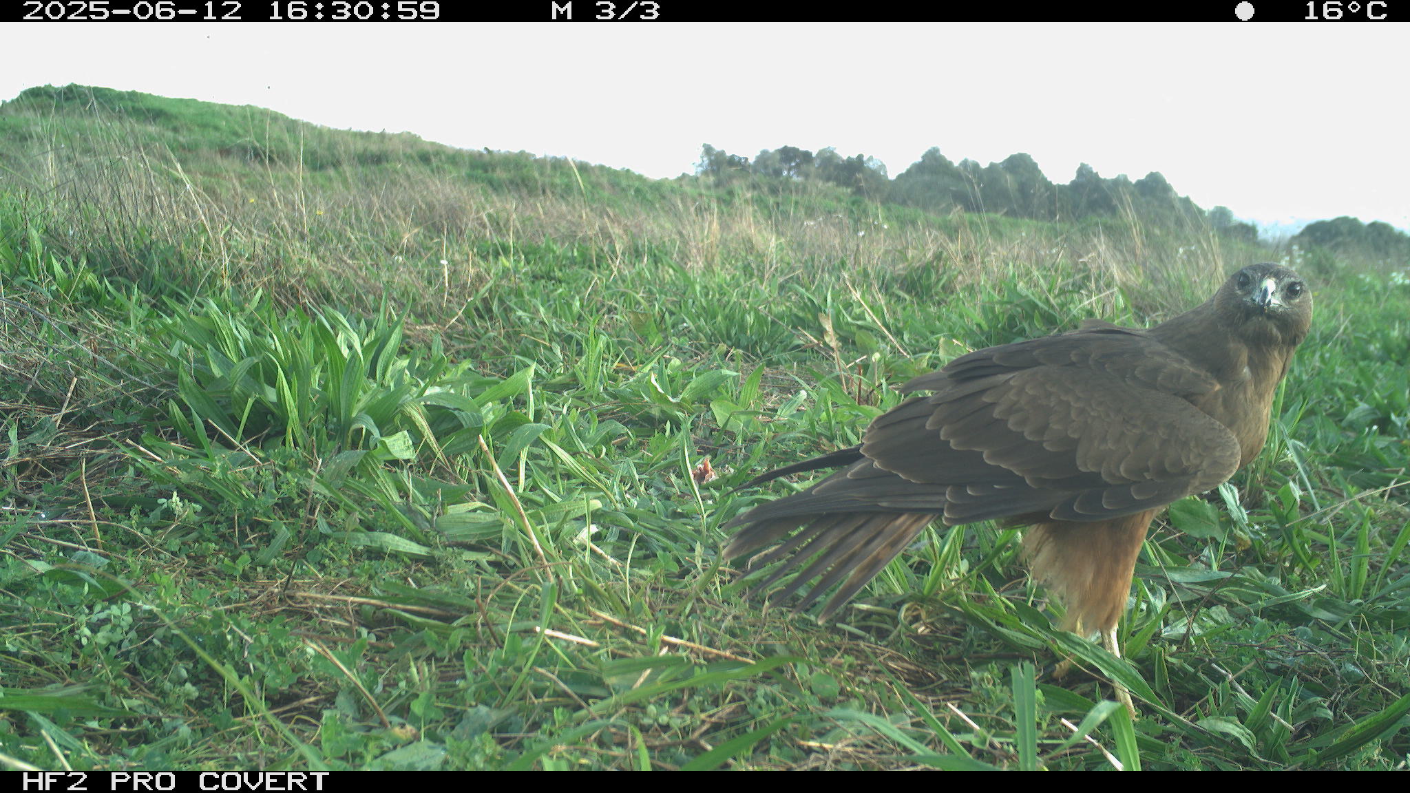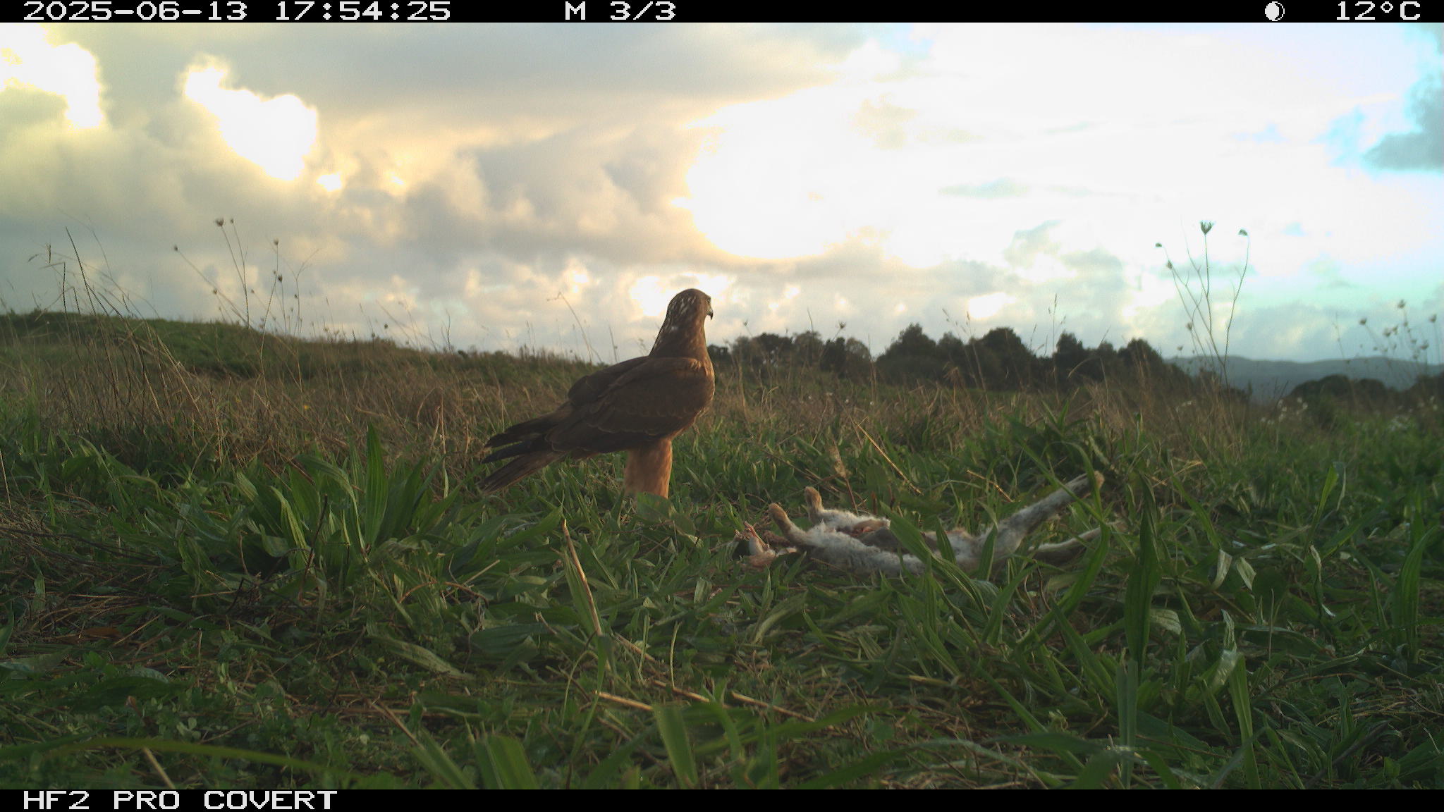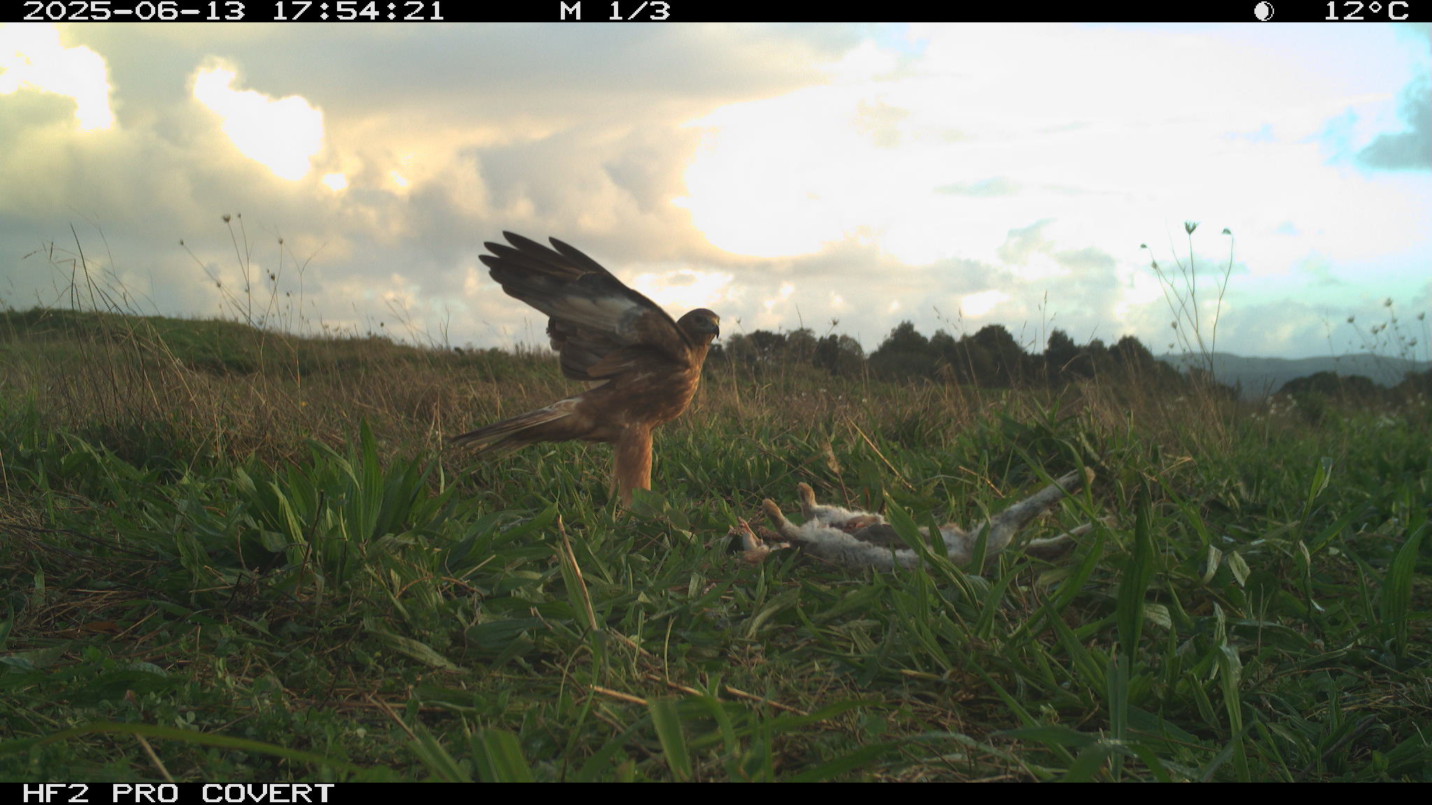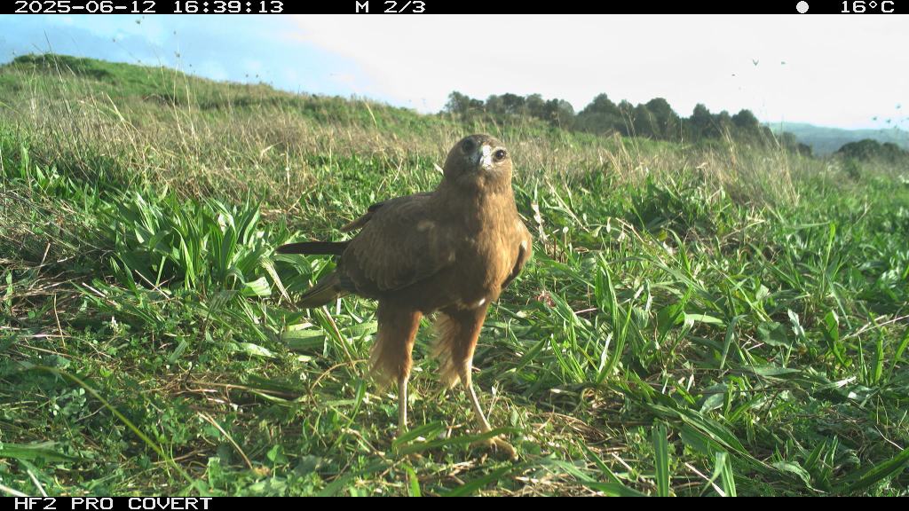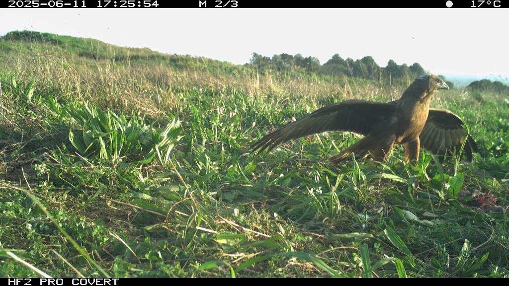 During preliminary testing, I had set up cameras at the test site (which is in Waiuku) around the bait (rabbit carcasses to draw Kahu into the area to establish a regular feeding site). They picked up some pretty awesome images – notably two Kahu that can be told apart (one has a white patch on the back of the neck, and the other has a white patch on the back of the head).